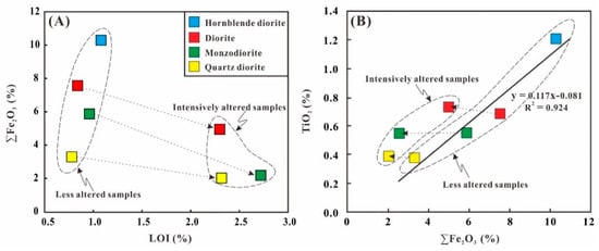 (A) ∑Fe2O3 vs. loss on ignition (LOI) diagram of intrusive rocks with different lithologies, especially for the less altered and intensively altered samples. (B) ∑Fe2O3 vs. TiO2 diagram of intrusive rocks with different lithologies, especially for the less altered and intensively altered samples.