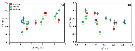 (A) Variations of δ56Fe values as a function of ∑Fe2O3/TiO2 ratios in diorites from the Han-Xing Fe skarn deposit. (B) Variations of δ56Fe values as a function of Fe2+/Fe3+ ratios in diorites from the Han-Xing Fe skarn deposit. Data of Wu’an are from the reference [12]. Error bars indicate 95% CI of the mean.
