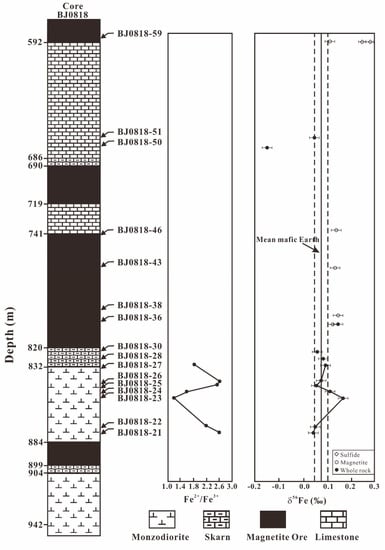 Twenty-four whole rocks (including diorites, skarn, iron ores and limestone) and twenty-five mineral separates from iron ores and skarns (including magnetite, skarn silicate minerals and sulfides) were analyzed for their Fe isotopes. The results are listed in Table 3. The δ56Fe values of whole rocks range from −0.203‰ to +0.172‰. Among them, limestone has a lower δ56Fe than diorites. Skarn and ores have various δ56Fe values which should be caused by their heterogeneous composition. The δ56Fe values of mineral separates range from −0.210‰ to +0.359‰. Among them, sulfides host the highest δ56Fe values. Magnetite has limited δ56Fe variation (+0.052‰ to +0.147‰). Skarn silicates have various δ56Fe values, which is consistent with the large variation of mineral compositions in skarn. In addition, an approximate sequence may exist, i.e., δ56FeEp > δ56FeGt > δ56FeDi.