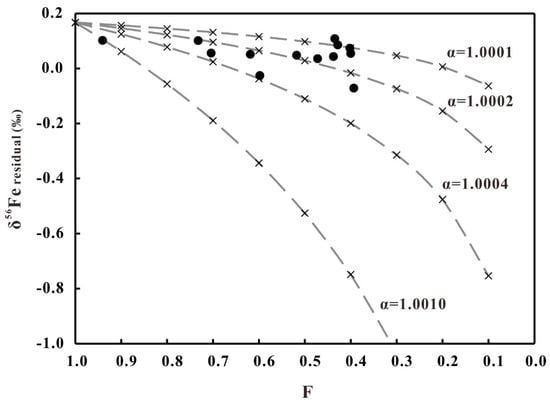 If we assume that iron was leached from diorites following Rayleigh fractionation, the equation (1000 + δ56FeA)/(1000 + δ56Fei) = F(αB−A − 1) can be applied, where A refers to the altered diorite as the residual phase, B refers to the iron leached from the diorites, i refers to the initial δ56Fe values and F (F = (∑Fe2O3/TiO2)A/(∑Fe2O3/TiO2)i) refers to the proportion of iron in the altered diorites to the initial content. In this present case, i is represented by fresh or less altered diorites. The fractionation factor between leached iron and altered residues is calculated. αB-A varies from 1.00006 to 1.00043 (Table 4 and Figure 7) (except one data of 1.00112) with an average of 1.00020, which is consistent with the iron isotope fractionation factor between magnetite and Fe silicates (0.2‰ to 0.25‰ at 700 °C) [36,37]. Thus, iron isotope fractionation during hydrothermal alteration may be dominantly controlled by the dissolution of magnetite from diorites.