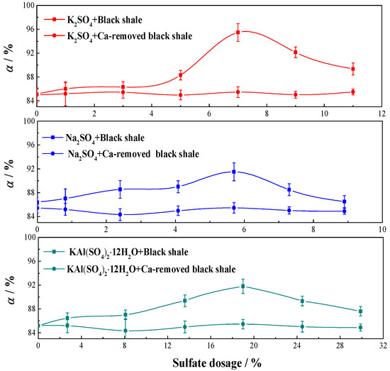 The three common sulfates (K2SO4, Na2SO4, and KAl(SO4)2·12H2O) were investigated and the leaching results are shown in Figure 2. The vanadium leaching efficiency can maintain at 85% after calcite in black shale was removed by hydrochloric acid in advance. The three sulfates can increase the vanadium leaching efficiency beyond 90%. The sulfates are directly related to the calcium phase in the black shale. The vanadium leaching efficiency firstly increased and then decreased with sulfate dosage. When adding K2SO4 at the dosage of 7wt.%, the vanadium leaching efficiency topped out at 95.60%. K2SO4 was chosen as assisted-leaching agent for investigating the vanadium leaching kinetics of black shale.