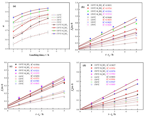Variations of vanadium leaching efficiency as a function of leaching time with acid concentration of 4 M and K2SO4 dosage of 7 wt% at 110 °C, 130 °C, 150 °C, and 170 °C, respectively (a) and linear-fitting curves of Equations (2)–(4) (b–d) basing on the data in (a). The dashed lines and hollow points represent the vanadium leaching efficiency and corresponding linear-fitting curves without K2SO4 addition, other leaching parameters being equal.