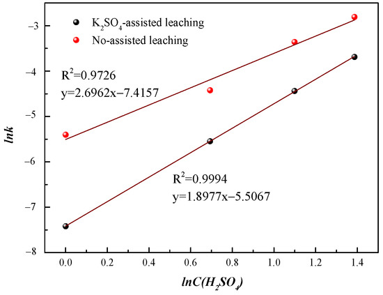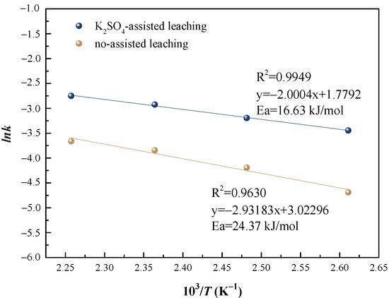 The time-dependent leaching data in Figure 3a was fitted by Equations (2)–(4) and the fitting results are shown in Figure 3b–d. The linear fitting curves of Equation (4) can pass though the origin and the correlation coefficients R2 were higher than the required coefficient (0.9196) when the confidence is 99%. The vanadium leaching rate can be judged under mixed control. The apparent rate constants from the linear fitting results of Equation (4) was chosen to be substituted into the Arrhenius equation (lnk = lnA − Ea/RT) to construct the Arrhenius plot, as shown in Figure 4. The apparent activation energy (Ea) of vanadium leaching process is calculated from the slope of the Arrhenius plot. Comparing with no assisted leaching, the apparent activation energy of K2SO4-assisted leaching declined from 24.37 kJ·mol−1 to 16.63 kJ·mol−1, which marked the increasing vanadium leaching rate.