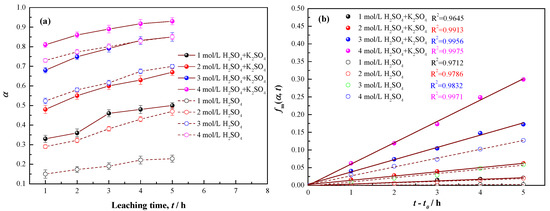 Variations of vanadium leaching efficiency as a function of leaching time with leaching temperature of 150 °C and K2SO4 dosage of 7 wt% at acid concentrations of 1 M, 2 M, 3 M, and 4 M, respectively, (a) and linear-fitting curves of Equation (4), (b) based on the data in (a). The dashed lines and hollow points represent the vanadium leaching efficiency and corresponding linear-fitting curves without K2SO4 addition, other leaching parameters being equal.