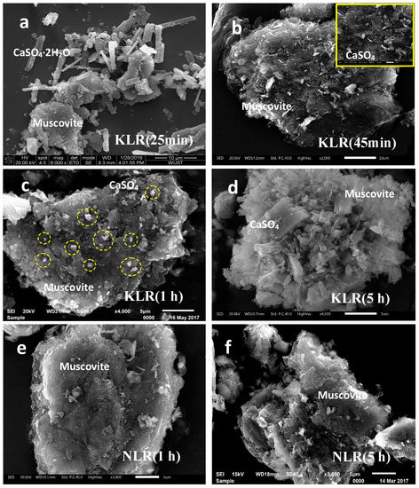 It was observed that CaSO4 crystals were deposited on muscovite and disintegrated muscovite particles in the KLR. Rod-like CaSO4·2H2O crystals were observed below 100 °C in Figure 8a. Tiny CaSO4 crystals with longitudinal growth concentrated upon muscovite surface when the temperature initially rising to 150 °C (seen in Figure 8b) and transformed into lateral growth over time (seen in Figure 8c,d). This transformation of crystal shape was accompanied with muscovite surface cracking and decomposing.