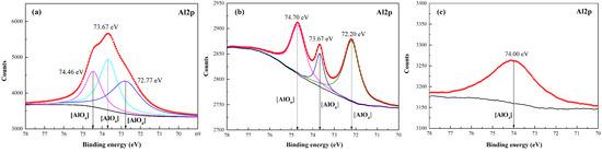 The chemical states of Al2p in the KLR and the NLR were also studied by XPS and the results are shown in Figure 9. There are four-coordinated Al and six-coordinated Al in the black shale. The four-coordinated Al exists in muscovite and feldspar while the six-coordinated Al just exists in muscovite. So, the six-coordinated Al content can trace muscovite surface. The four-coordinated Al in aluminum-oxygen tetrahedron has a binding energy of about 73.4~74.55 eV and the six-coordinated Al in aluminum-oxygen octahedron has a binding energy of about 74.1~75.0 eV. As seen in Figure 9a, the Al2p fine spectrum of the black shale was split into three peaks, two of which at 74.46 eV and 73.67 eV belongs to the six-coordinated Al and the four-coordinated Al, respectively.