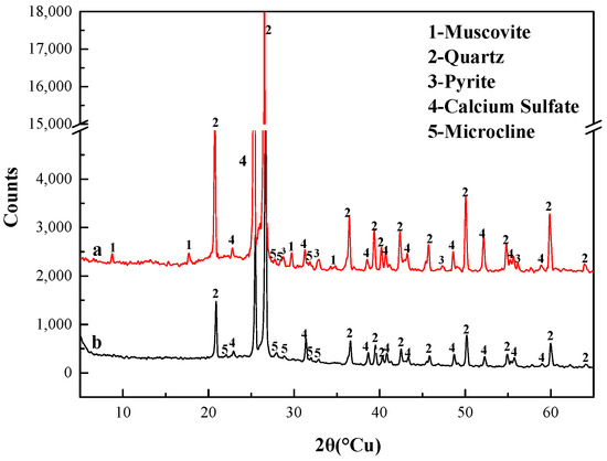 Under K2SO4 assistance, the Al2p fine spectrum peaked at the binding energy of 74.00 eV that belonged to the four-coordinated Al. Without assistance, the Al2p fine spectrum was split into three peaks, two of which at 74.70 eV and 73.67 eV belonged to the 6-coordinated Al and the four-coordinated Al, respectively. Moreover, it cannot be ignored that the peaks with binding energies of 72.20 eV and 72.77 eV in Figure 9a,b disappeared in Figure 9c. Based on XRD analysis (Figure 10), the four-coordinated Al in the KLR should be located in microcline. So the peaks with binding energies of 72.20 eV and 72.77 eV belonged to [AlO4] in muscovite structure and disappeared in the KLR, indicating the disorganization of muscovite structure.