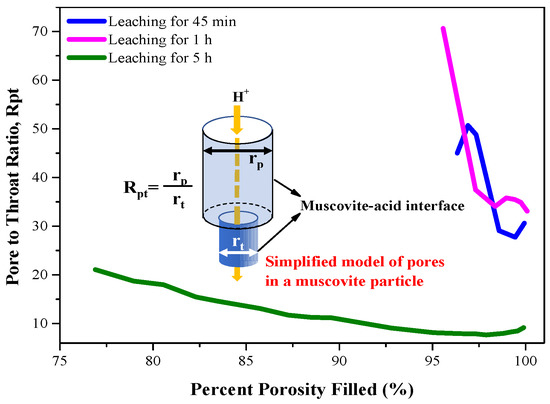 As shown in Figure 11, the KLR had a narrow pore to throat ratio (Rpt) range from 30 to 45 at the leaching time of 45 min. However, the Rpt went up and broadly ranged from 33 to 70 at the leaching time of 1 h, which indicated that the pore throat size decreased and the pore size increased. It can be deduced that massive pores initiated and proliferated in the existing pores within one-hour leaching. This change will bring about the increasing of muscovite–acid interface. As the leaching time reached five hours, the Rpt obviously dropped off and just ranged from 9 to 21, which manifested that the pore throat size was approaching the pore size. The pores should be expanded as a result of interfacial reaction of muscovite dissolution.