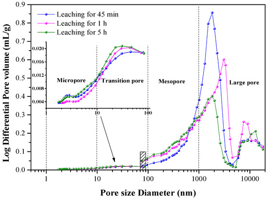 Pore size distribution in the KLR obtained from leaching for different time points with 4 mol/L H2SO4 and 7 wt% K2SO4 at 150 °C.