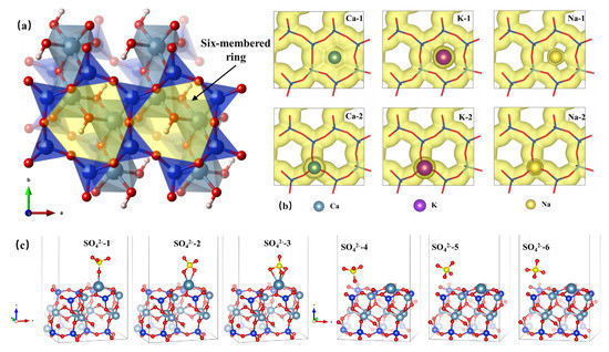 The structure model of muscovite after Ca2+ absorbing in the six-membered ring cavity of silicon-oxygen tetrahedrons was thus built up. Six possible locations were selected to determine the optimal bond-making position of SO42− to this structure model. As shown in Figure 13c, the first three locations of SO42− are above Ca2+ with different location angles while the latter three locations of SO42− are in the cavity of six-membered ring of silicon-oxygen tetrahedrons with different location angles.