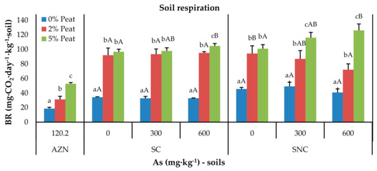 Basal respiration rate (BR) for soil samples with different treatments. Lowercase letters indicate statistically significant differences for each treatment with different peat additions; and capital letters among the different treatments with As for the same peat content (Kruskal-Wallis test, p < 0.05).
