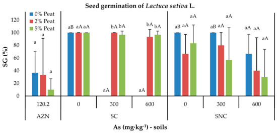 Percentage of germination for Lactuca sativa L. seeds (SG%) exposed to the different soils and treatments. Lowercase letters indicate statistically significant differences for each treatment with different peat additions; and capital letters among the different treatments with As for the same peat content (Kruskal-Wallis test, p < 0.05).