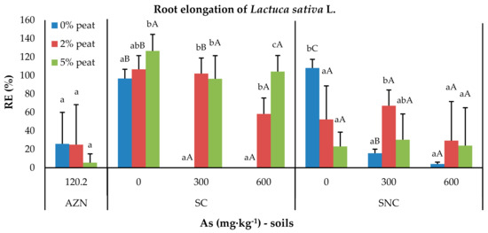 Lactuca sativa L. root elongation (RE%) in the soils with different treatments. Lowercase letters indicate statistically significant differences for each treatment with different peat additions; and capital letters among the different treatments with As for the same peat content (Kruskal-Wallis test, p < 0.05). Values higher than 100% indicate hormesis.