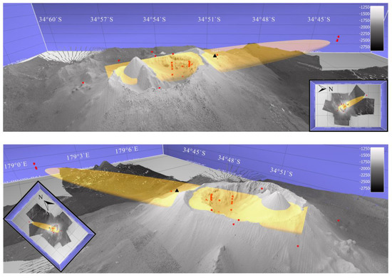 The overlapping local bathymetry of the caldera rim was subtracted from the calculated ellipsoid volumes to obtain the correct hydrothermal plume volumes. The main current direction, based on the lowered Acoustic Doppler Current Profiler (LADCP) data, was northward with a variable East/West component (Figure 3). To account for the main current direction, the section of the ellipsoids expanding beyond the southern end of the caldera wall was neglected and consequently subtracted from the volume, as intense plume dispersion against the main current direction is considered unlikely. The arithmetic mean of the two corrected ellipsoid volumes was then further used in the calculation (Vplume) to obtain SHD (Equation (3)).