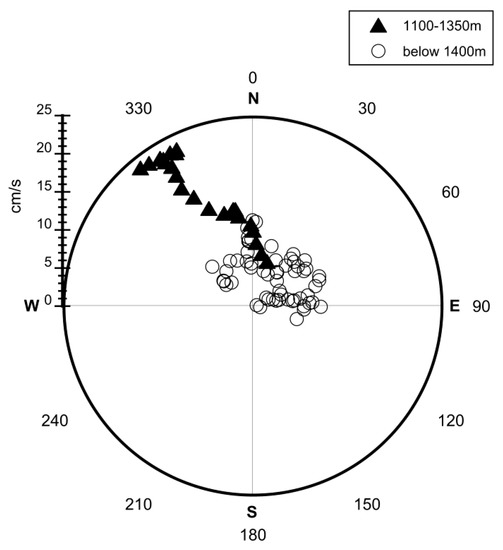 Mean-lowered Acoustic Doppler Current Profiler (LADCP) data obtained from multiple vertical CTD casts at Brothers volcano. The displayed data is separated in the two depth intervals 1100 m–1350 m and deeper than 1400 m.