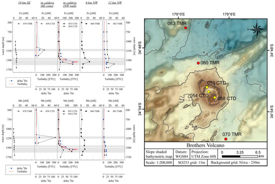 Three vertical CTD casts were carried out within the Brothers caldera (053 CTD, 054 CTD, and 058 CTD, Figure 4 and Appendix A.2 Table A1). Dissolved metal concentrations, turbidity signals, and He data indicate three plume depths within the caldera. Diffuse and clear to white fluid venting at the two cones in the SE of the caldera, located at 1196 m (main cone) and 1300 m (side cone) water depth probably results in the shallowest plume found between 1200 m and 1250 m [15]. The two deeper plumes below 1350 m likely result from black smoker venting at the NW caldera wall. With increasing distance to the NW (outside the caldera), the two deeper plumes within the predominant current direction (Figure 3) remain clearly detectable based on 3He concentration. The metal concentrations decreased from max. concentrations of 250 nmol/L Fe at the vents to 12 nmol/L 6 km NW and 15 nmol/L at 12 km NW of the caldera (Figure 4), thereby still being enriched compared to ambient background Fe concentration (around 1 nmol/L). Manganese concentrations, however, showed a consistent decrease with increasing distance from the caldera. Inside the caldera, max. concentrations of around 150 nmol/L Mn were found and decreased subsequently to 11 nmol/L and 3–5 nmol/L at 6 km NW and 12 km NW of the caldera, respectively.