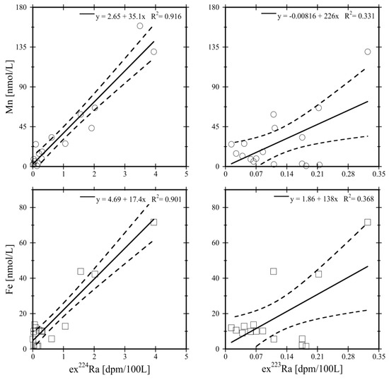Linear correlations of ex224Ra and ex223Ra activities with dissolved Mn and Fe within the plume of Brothers volcano. The dashed lines indicate the 95-percent confidence interval.