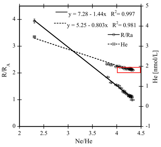 He isotope ratio to atmospheric He isotope ratio (R/RA) and total helium concentrations of hydrothermal plume samples from Brothers volcano plotted against the Ne/He ratio. The linear trends were extrapolated to calculate the 3He and 4He concentration in the end member fluid at Ne/He = 0. The average Pacific deep water He concentration and Ne/He ratio is marked with a red frame; averages were taken from Ozima and Podosek [81]. Please note that errors are within the range of the symbol size.