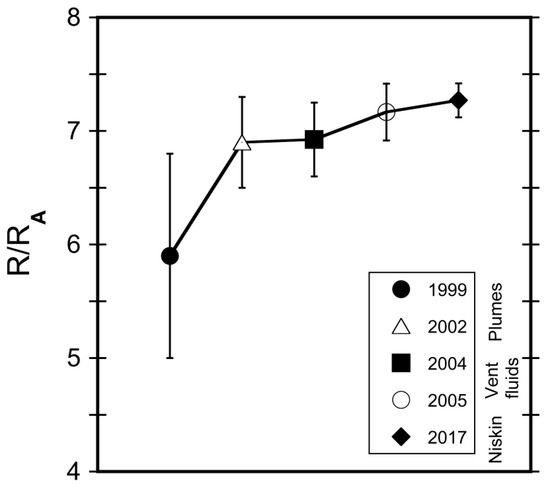 Brothers NW caldera end member fluid He isotope composition expressed as a factor of the atmospheric 3He/4He ratio (R/RA). The figure is modified from de Ronde et al. [15]. Data for 1999 and 2002 were estimated based on plume samples, 2004 and 2005 ratios were directly measured in end member samples and the 2017 ratio is extrapolated from Niskin bottle samples (see Section 3).