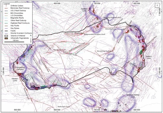 The Bushveld Complex (BC) represents the world’s largest source of platinum group metals (PGM), which are critical for multiple industrial applications, from automotive catalysts to components in medical equipment. The BC has been the focus of numerous studies, predominantly on whole rock geochemistry and mineralogy, which seek to develop models for PGM genesis and intrusion mechanisms [1,2,3,4,5]. The majority of these studies examine the cumulate layering across various mines and exploration projects, albeit with limited or only very local contextualization within the overall complex. Without adequate contextualization, analytical results and interpretations from such studies tend to be piecemeal and more subtle trends, that might only become apparent from larger datasets or across larger domains, are not evident. Such subtle trends may hold valuable clues regarding the formation of the complex. Furthermore, relatively little work has been undertaken on the overall 3D structural geometry of the complex, as noted by numerous authors [6,7,8,9,10,11].