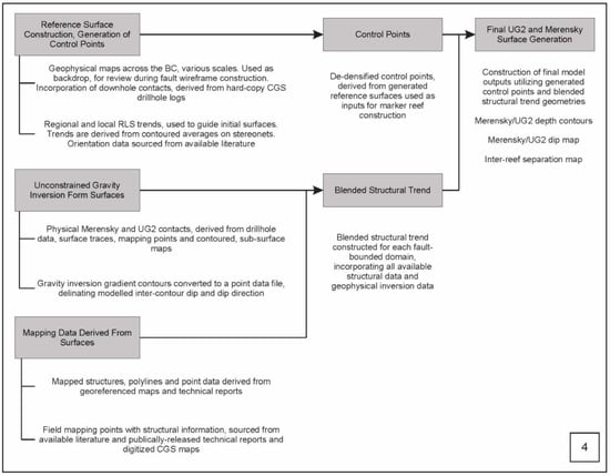 - Construction of structural trends, incorporating trends and surfaces produced in unconstrained geophysical data inversions (see Basson, 2019 [11] for a description of these); and