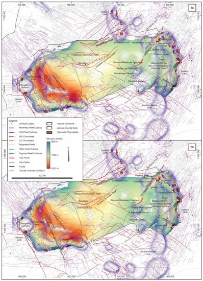 The northern portion of the EL appears to be absent to the west of Messina Mine. The modelled Merensky and UG2 Reefs shallow, and then steepen north-upwards, towards and along the TML–Zebediela–Welgevonden/Southern Fault systems. In addition, the EL becomes progressively more faulted, evidenced or accompanied by rapid shallowing of both reefs (Figure 8 and Figure 9), towards the northern margin of the main chamber and in proximity to the left-lateral Stofpoort/Wonderkop Fault system. This apparent uplift and steepness along the northern model margin, in conjunction with the development of the Stofpoort/Wonderkop Fault System(s), likely developed in response to N-S compression of the complex [11,72]. This southward vergence and asymmetry are also evident from the Droogekloof Thrust—Southern Boundary Fault system near the Thabazimbi/Rooiberg area. The variation in modelled inter-reef separation in this area may represent the effects of a forward-propagating thrust system that acted through the central part of the main chamber, as proposed by Basson (2019) [11].
