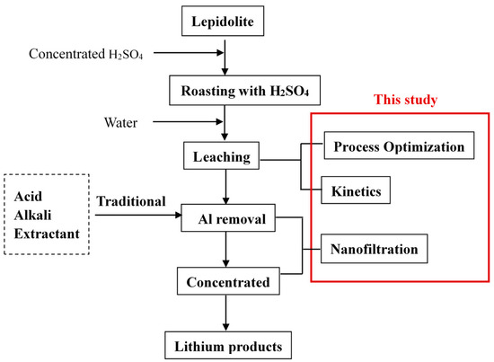 Gao, L.; Wang, H.; Li, J.; Wang, M. Recovery of Lithium from Lepidolite by Sulfuric Acid and Separation of Al/Li by Nanofiltration. Minerals 2020, 10, 981. https://doi.org/10.3390/min10110981