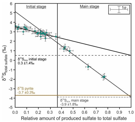 δ34S variations of sulfates as a function of their increasing amount during the initial and main stages of pyrite leaching. The dashed lines show the δ34S values of sulfate that are produced in the initial and the main stages. The vertical line demonstrates the transition from the initial to the main stage of pyrite leaching. Redrawn from Brunner et al. [].
