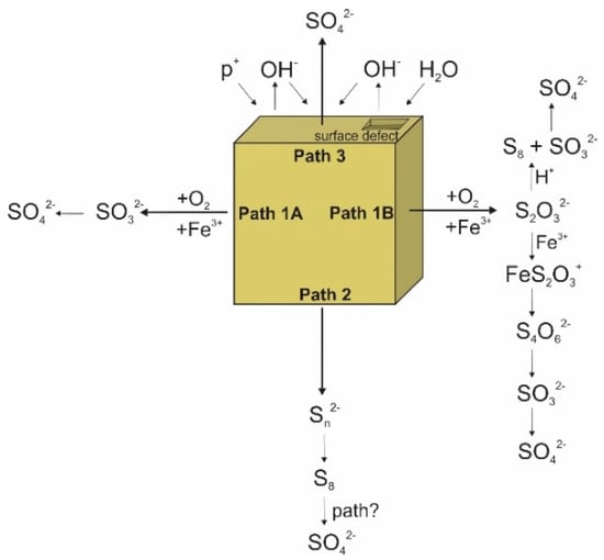 Schematic representation of different sulfide oxidation pathways: Paths 1A and 1B represent thiosulfate oxidation pathways where thiosulfate detaches and where the S–S bond breaks instead of the Fe–S bond releasing sulfite directly []. Path 2 represents the sulfide–polysulfide-elemental sulfur pathway of monosulfides [] and Path 3 represents the defect/photochemically driven pathway where surface electron defects can initiate pyrite oxidation by surface water and drive the subsequent sulfur oxidation by OH− []. Figure modified from Druschel and Borda [].