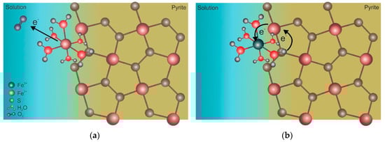To understand the reason for significant water oxygen incorporation into sulfate at low pH even under oxygen-saturated conditions, it is necessary to review the mechanism of pyrite oxidation. The initial step is the oxidation of the adsorbed Fe2+(H2O)6 complexes on the pyrite surface by molecular oxygen to form Fe3+(H2O)6 complexes that rapidly oxidize the pyrite (Figure 3) [,]. During the initial release of Fe2+ to solution, the pyrite surface is dominated by sulfur atoms []. The adsorbed iron continuously experiences oxidation and reduction during the interaction with molecular oxygen and the acceptance of electrons from the pyrite (Figure 3). The latter process is governed by the electron loss of iron on the pyrite surface during the interaction via molecular oxygen []. The electron originates from the sulfur site and its transmission to Fe3+ takes place via the iron site of the mineral (Figure 3b).