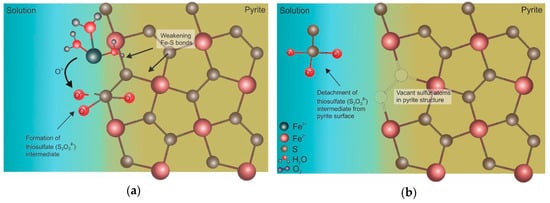 An oxygen atom from the adsorbed Fe3+(H2O)6 complex is added to the sulfur site of pyrite as the closing step of pyrite oxidation that produces different sulfur intermediates (Figure 4a) [,,]. The reaction sequence of the oxidation-reduction of the Fe3+ in the adsorbed aqueous complex, and the transfer of oxygen from water molecules to the sulfur site of pyrite, continues until a sulfur oxyanion is more stable in solution, and disassociates from the pyrite surface (Figure 4b) [].