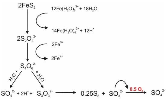 The oxidation of sulfide minerals takes place through several chemical reactions, as shown here for pyrite in Reactions (4)–(6) []:
