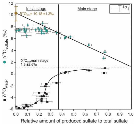 δ18O variations of sulfates and interacting water as a function of the increasing amount of sulfate during pyrite leaching. The dashed line shows the δ18O values of sulfate that are produced in the main stage of dissolution. The gold circle illustrates the supposed δ18O value of initial sulfates in case of immediate conversion of sulfite to sulfate. The vertical line demonstrates the transition from the initial to the main stage of pyrite leaching. Redrawn from Brunner et al. [].