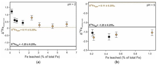 Fractionation of iron isotopes between solution and sulfide-rich rocks (Δsolution-rock = δ56Fesolution – δ56Ferock) as a function of Fe recovery (a) under pH = 2 and (b) pH = 5 conditions during continuous batch leaching. Square symbols—leachate of sulfide rock (SR) group: pyrite, chalcopyrite, galena, sericite, pyrophyllite, anglesite, sphalerite. δ56FeSR = –1.25 ± 0.25‰. Circle symbols—leachate of quartz-sericite-pyrite (QSP) group: pyrite, sericite, pyrophyllite, quartz. δ56FeQSP = 0.11 ± 0.25‰. Redrawn from Fernandez and Borrok [].