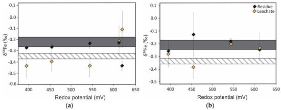 Plot of δ56Fe values in residues and leachates as a function of redox potential for (a) bioleaching and (b) electrochemical leaching of pyritic chalcopyrite concentrate. Grey areas represent the initial isotopic composition of the mineral concentrate with 2σ errors. Dashed areas represent the initial isotopic composition of the solution with 2σ errors. Error bars of samples are 2σ. Redrawn from Rodríguez et al. [].