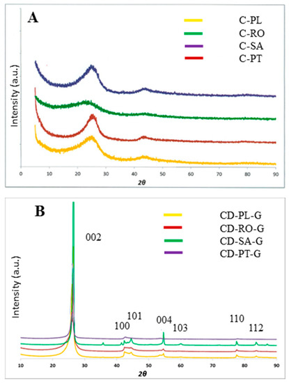 XRD diffractograms: (A) char concentrates from Poland (C-PL), Romania (C-RO), South Africa (C-SA), and Portugal (C-PT); (B) graphitized demineralised char concentrates from Poland (CD-PL-G), Romania (CD-RO-G), South Africa (CD-SA-G), and Portugal (CD-PT-G).