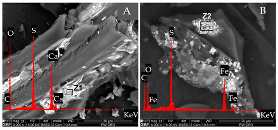 Mineral matter in the Romanian char concentrate sample (C-RO): (A) gypsum (×3000; BSE mode); (B) pyrite (×5000; BSE mode).