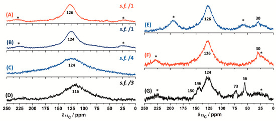 The 13C direct polarization spectra show that the unique signal in each sample is present at a δ13C around 110–130 ppm (Figure 9); this is common in graphitic materials [77,78,79,80]. The CD-RO and CD-PL samples once again show the highest and sharpest NMR signal, related to the higher degree of order within the organic structure. The CD-SA and CD-PT samples contained mainly disordered or amorphous char according to the 13C DP data. The 13C CP-MAS analyses were only successful for CD-RO and CD-PL samples, considering the higher proton content observed from the 1H MAS analyses.
