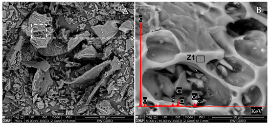 Inorganic matter remaining embedded in the chars following demineralisation and the respective EDS spectra: (A) CD-PL (×500; BSE mode); (B) CD-SA (×750; BSE mode).