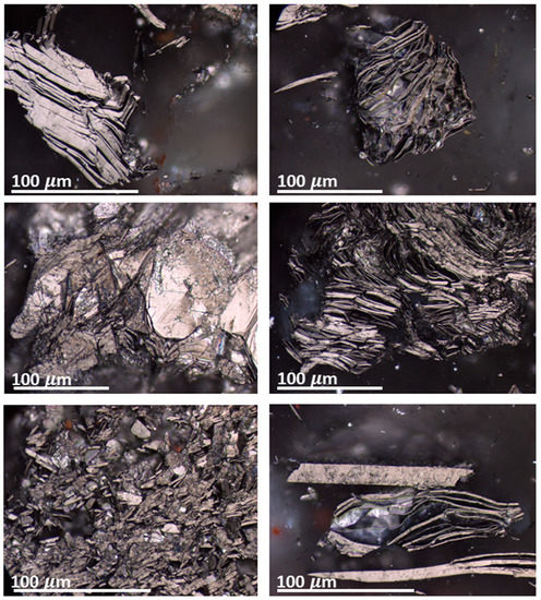 A collection of flake graphite particles found in the natural graphite reference sample.