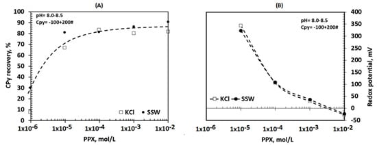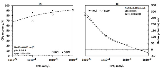 3.2. Effects of Salinity on Chalcopyrite Flotation Using PPX
