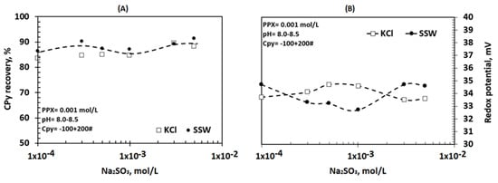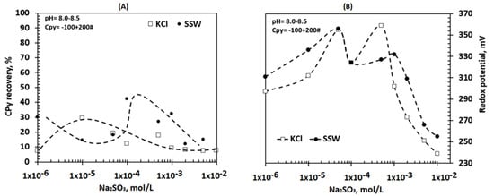 3.3. Effect of Sodium Sulfite Concentration on Flotation without the Chalcopyrite Collector in Saline Solutions