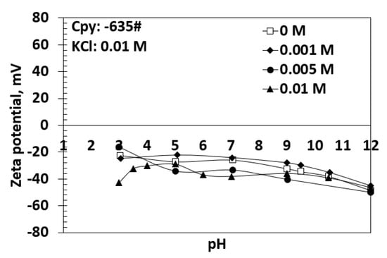 4.2. Effects of Potassium Propyl Xanthate and Sodium Sulfite on Chalcopyrite Zeta Potential Using KCl
