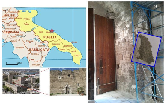 Figure 1. Map of south Italy indicating the city of Bari (red star), where the limestone masonry of Castello Svevo is located (a) and the internal castle wall from where the fragment studied (blue inset) was collected (b).