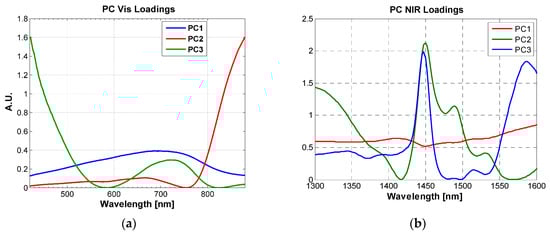 Figure 5. Loading plots of PC1, PC2 and PC3 images calculated in the Vis range (420–880 nm) (a) and NIR range (1300–1615 nm) (b).