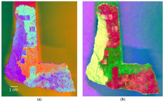 As a first step, PCA was applied to the Vis data in the 420–885 nm range. The first three PC images, which accounted for 99.8% of the cumulative variance, were combined in the three-chromatic red–green–blue (RGB) channels, so yielding a false-color image that highlighted the differently treated areas of the fragment. Specifically, the graph of the first three PC loadings (Figure 5) illustrates the spectral weight of each image, i.e., how each wavelength contributed to each PC. Overall, PC1 had a similar contribution from each wavelength, whereas PC2 accounted for the spectral changes in the 750–880 nm range, and PC3 depended markedly on the 400–600 nm range and, to a lesser extent, on the 600–800 nm range. Thus, the false-color image obtained by assigning PC1 to B, PC2 to R and PC3 the G channels clearly mapped the differently cleaned areas (Figure 6a). The cyan color (Green + Blue, influenced by PC1 and PC3) corresponded to the zones laser cleaned with a single wavelength (1064 nm), which resulted essentially in removing the black crust, so causing a strong change of color (from dark to white-yellow) of the surface, but did not affect the inner layer. Differently, the purple areas (Red + Blue) represented zones cleaned more in-depth, using the two wavelengths (1064 and 532 nm), which affected the reflectance features also in the NIR region. The comparison with the visual image in Figure 4a showed that the map highlighted the shapes and sharp contours of the test-cleaning areas, thus providing a tool to promptly visualize the extent, homogeneity and type of the treatment, so enabling the discrimination of details (e.g., residual non totally cleaned zones) that were not detectable at the naked eye.
