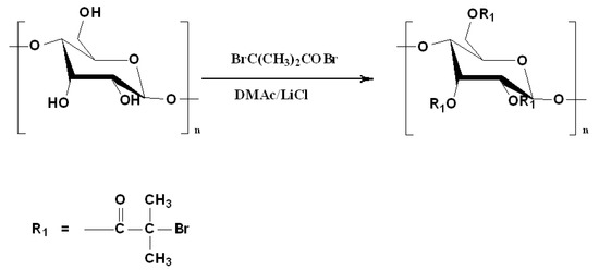 20 mL of LiCl/DMAc (5%) solution and 0.5 g of starch (9.26 mmol OH) were added to a 50 mL round-bottom flask equipped with a magnetic stirring bar and condensation column. The content of the flask was mixed and under reflux at 80 °C for about 2 h and then cooled down to room temperature. Pyridine (1.6 g, 20.22 mmol) and 2-bromo-2-methylpropionyl bromide (BIBB, 4.34 g, 18.52 mmol) were then added to the flask and the content was stirred overnight at room temperature (RT). The reaction product was dispersed in 200 mL 2 M HCl, filtered, washed three times with distilled water and methanol, and then dried under vacuum for 12 h at 50 °C.