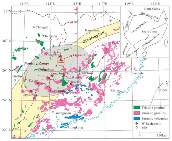 The Xitian intrusion is located in the central part of the Nanling Range, accompanied by tin-polymetallic deposits [24]. Nanling Range is one of the world’s most important magmatic-hydrothermal W-Sn provinces (Figure 1) [25,26,27]. It contains widely distributed granites and numerous W-Sn deposits, including Shizuyuan, Furong, Taoxikeng, Da’ao, Xihuashan, and Guposhan (Figure 1) [1,2,3,22].
