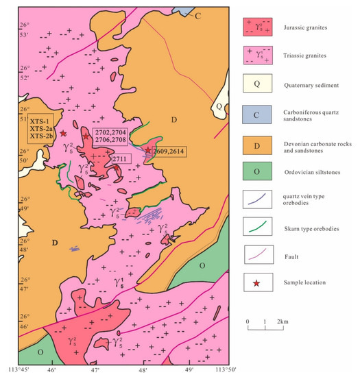 The Xitian intrusion is dumbbell-shaped and mainly occurred in two episodes: the Late Triassic (ca. 230 Ma) and the Late Jurassic (ca. 150 Ma) [24,32,33,34,35,36,37]. The Triassic plutons occurred as the batholiths intruded into Ordovician rocks and Devonian carbonate rocks. The Late Jurassic granites are scattered and intruded into the older Triassic plutons. They are mainly distributed in the interior of the pluton and along the eastern orebody (Figure 2). The two tectonic events accompanying large-scale magmatic activity result in the E-W trending and NE trending structures [36]. The Xitian ore field developed a series of symmetrical high-angle normal faults, as the bounding faults of Chahan rift basin [37,38]. The metallogenic magmatism mainly explodes in 175–150 Ma [22,27]. The ore veins mainly occurred in the contact zone between the granite and Devonian carbonate rocks. It is obvious that the faults control the ore veins in the area [39]. Tungsten is chiefly hosted in wolframite and scheelite, and tin is mainly in cassiterite. The ore veins of the W-Sn deposit are mainly distributed as veinlet-disseminated [22,38].