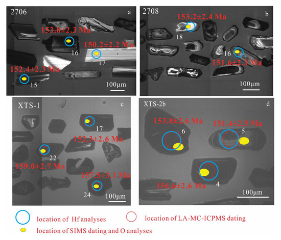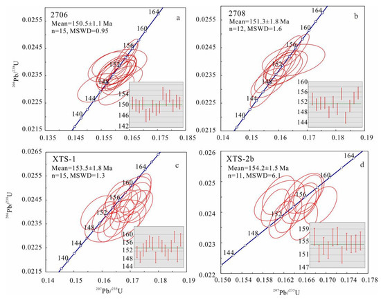 Zircon grains from the biotite granite and biotite monzogranite are colorless and transparent, behaving homogeneous and compositionally zoning in CL images (Figure 4). They are euhedral, prisms, and pyramids in shape, ranging from 80 to 250 μm in length. Concentric oscillatory zonings are generally developed in zircon grains, whose cores exhibit segments with sector zoning. Only a few zircon grains contain ovoid cores. Others show typical oscillatory zoning without inherited cores. Zircons in Xitian granites have variable Th (124–3650 ppm) and U (209–3596 ppm) contents, with Th/U ratios of 0.1–1.7. All these characteristics suggest that these zircons are magmatic in origin [50,51,52]. The analytical results of zircon U-Pb dating are summarized in Supplementary Table S1. Despite the captured and inherited crystals, zircon grains (2706) from the biotite monzogranite yield a weighted mean 206Pb/238U age of 150.5 ± 1.1 Ma (MSWD = 0.95, Figure 5). For the Xitian intrusion, samples of the biotite granite (2708) give a weighted mean 206Pb/238U age of 151.3 ± 1.8 Ma (MSWD = 1.6, Figure 5), which is the best estimate of the magma crystallization time.